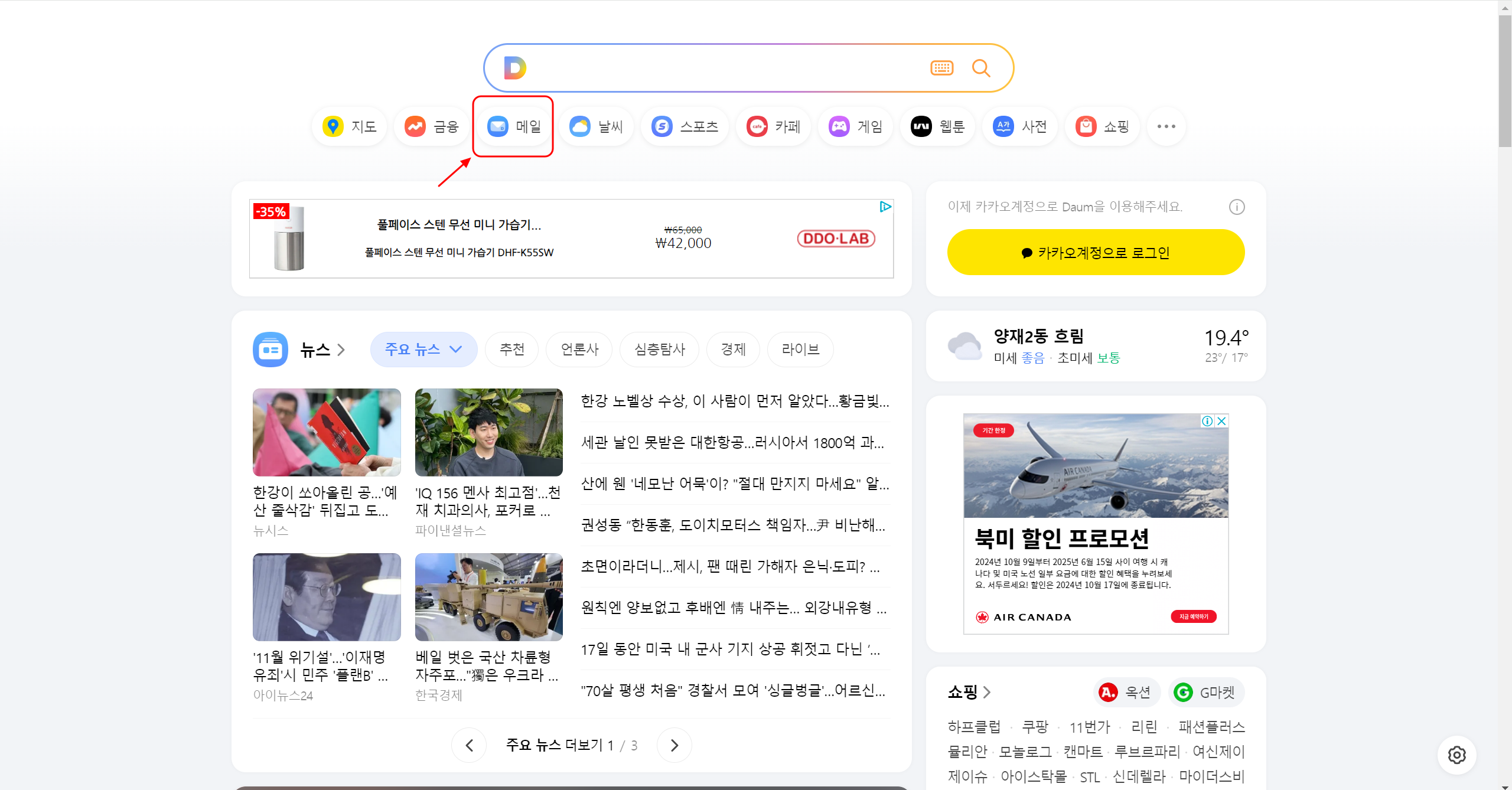 다음 포털 사이트에 접속해 '메일' 메뉴를 클릭하면 카카오 계정으로 로그인할 수 있는 화면이 나타납니다. 기존 다음 아이디 사용자는 간단한 절차를 통해 카카오 계정과 연동할 수 있습니다.