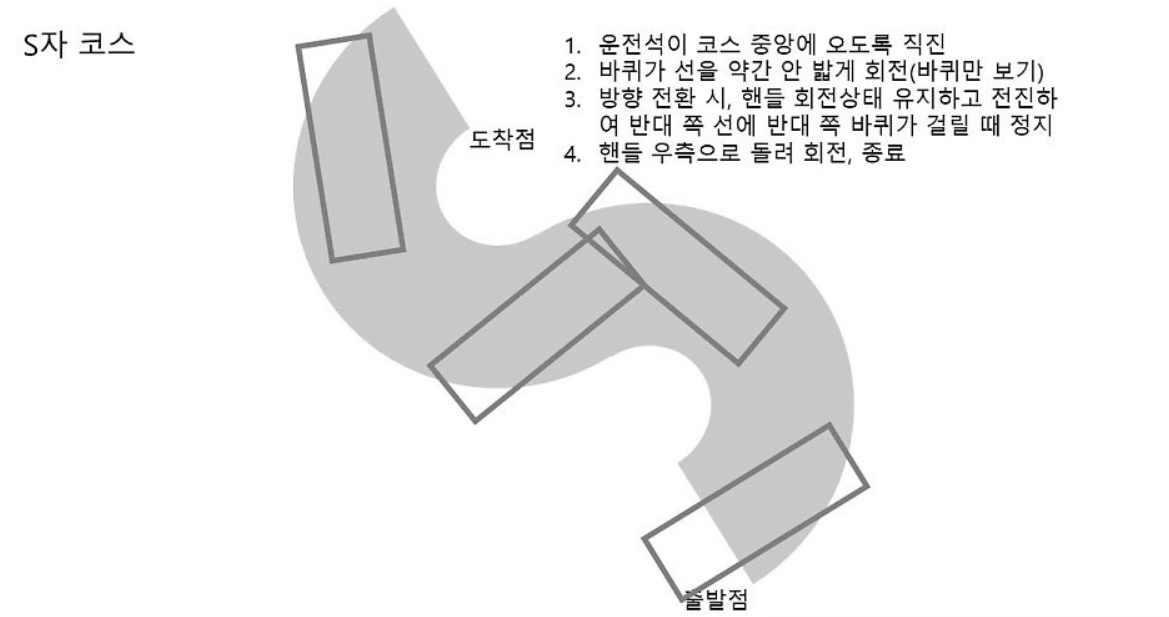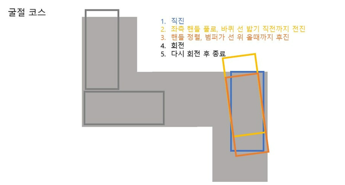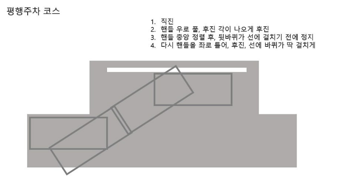 🔹코스 진입: 차체가 약간 오른쪽으로 치우쳐지도록 운전석을 중앙에 맞춰 진입합니다. 왼쪽 앞바퀴가 선에 보이면 정지하고, 핸들을 돌립니다.