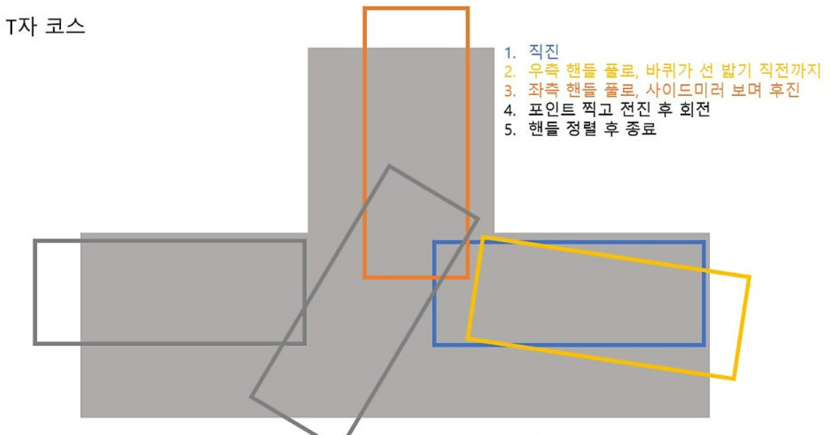 T자 코스는 후진이 포함되며 회전 반경이 넓어 후진 시 어려울 수 있습니다. 코스의 한쪽에 최대한 붙여서 진행하세요.
